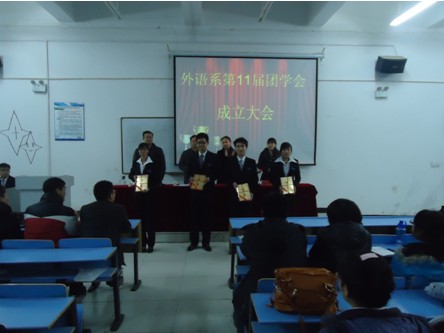 2012年11月20日晚7点,外语系第十一届团学会成立大会在文华楼阶四隆重召开。莅临本次大会的领导嘉宾有:外语系王长虹主任、校团委乔鲁宾老师、外语系党总支副书记主任助理李爱萍、外语系全体辅导员老师以及校员工会各院系的员工干部代表。