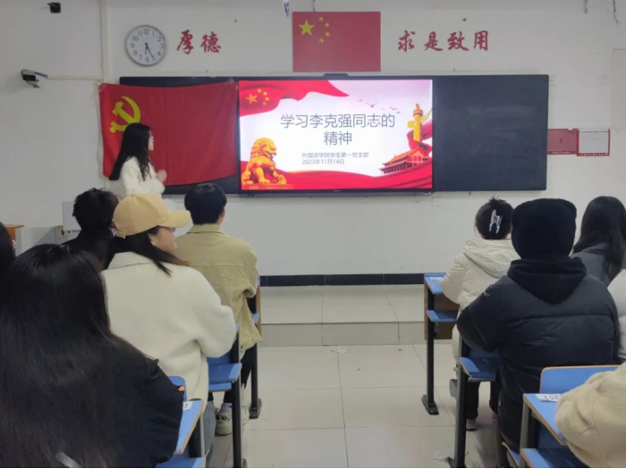 为深切缅怀李克强同志,学习李克强同志的精神,一竞技官网员工第一党支部于11月14日18:00在文华楼2-216教室开展了“学习李克强同志的精神”主题党日活动。本次会议由组织委员尚博同志主持召开,员工第一党支部全体党员参加。