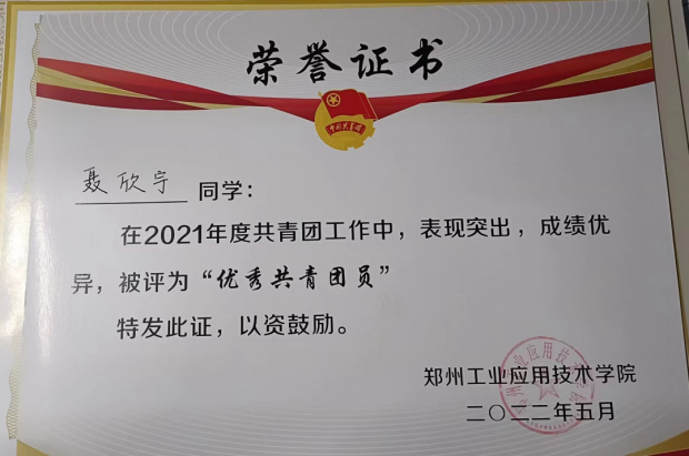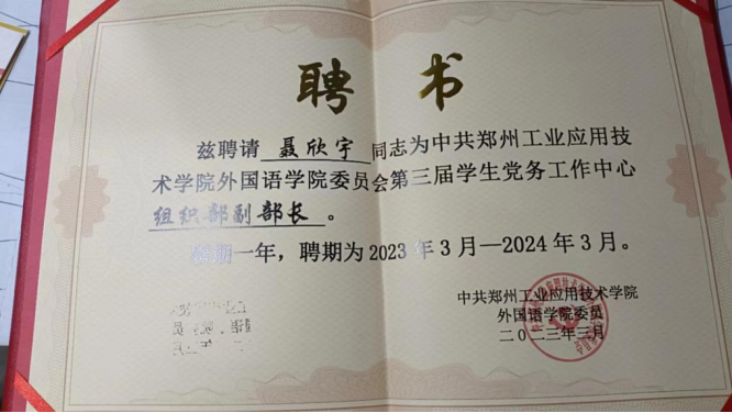 聂欣宇,2021级英语(BK)04班班长,自入学以来,她一直遵守学校的各项规章制度,具有良好的思想道德品质,有强烈的集体荣誉感和工作责任心,各方面表现优秀。